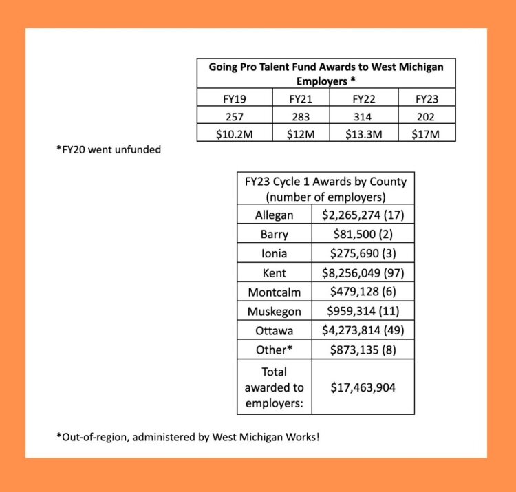 “We are proud of the impact that the Going PRO Talent Fund has had on the West Michigan economy and we are committed to continuing to support the growth and development of local businesses,” says Jacob Maas, CEO of West Michigan Works! “This critical funding will help employers hire, upskill, and retain their workforce, addressing the challenges of a lower labor force participation rate.”