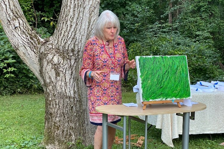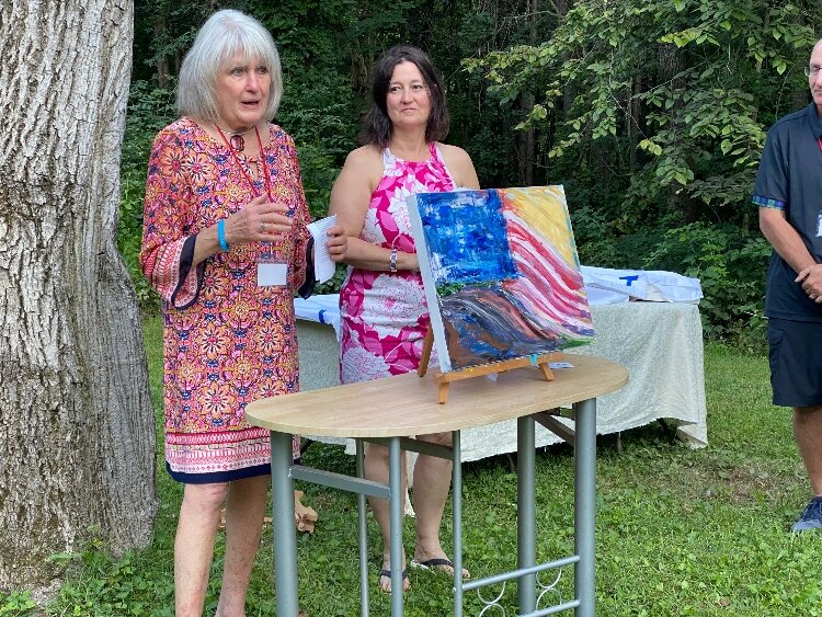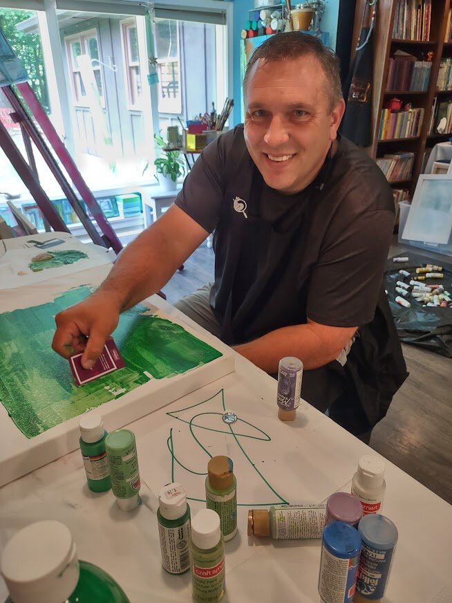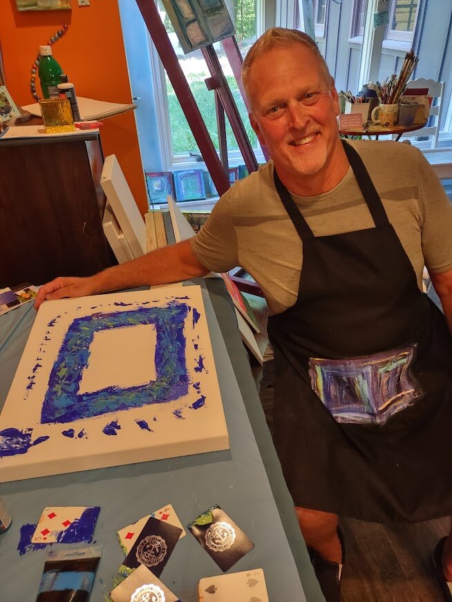 Williams, who took art classes while a student at Hope College, had fun working with Hagedorn. He learned a new technique from her that involved using cards to scrape the paint.
