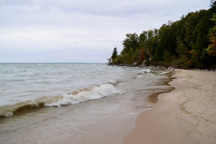 Sent a message to my wife letting her know I’m still alive. Set up camp. Walked down the sandy path linking my site with the beach. The distant hills of northwest Mitten were low on the horizon. The wind and waves of Lake Michigan had her imitating big sister, Lake Superior.