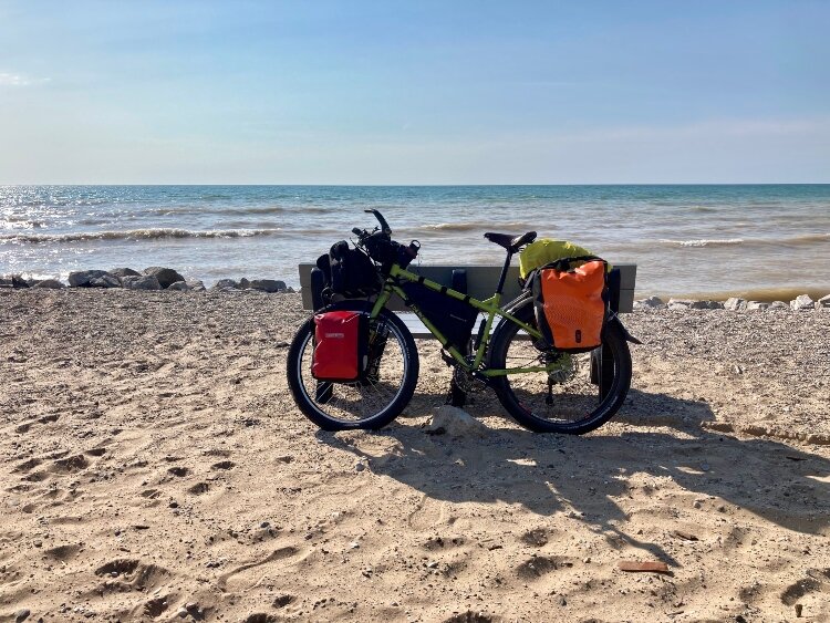 North of Manistee, Lakeshore Road brings me to a narrow little beach, just a buffer of sand between the road and the Lake. I get off the bike, take off my shoes, and wade my abused legs into the clear water.