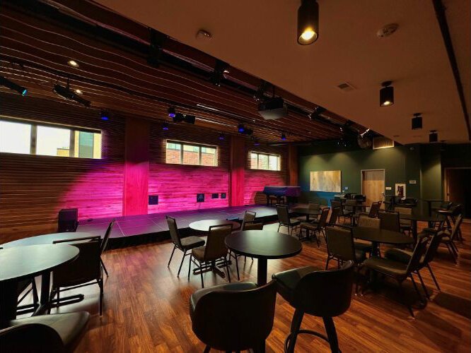One of those spaces is The Alluvion, a mid-sized performing arts and events space located on the building’s second floor. It features a stage and a bar, plus a small built-in recording space that enables live streaming and professional audio and video recording.