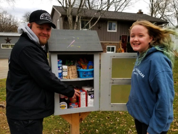 Jason Cottrell and his daughter, Gracie Jo, 11, pose in front of the little free pantry their family created in front of their home, 1237 Marlene St. Holland.
