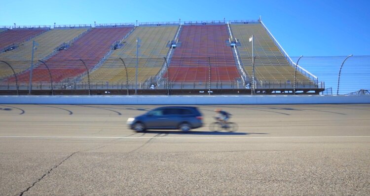 One of the unique aspects of doing this speed record on the NASCAR race track in Lenawee County was the banked surface. Ornée rode near the bottom of the track, where it was flatter but was still angled a bit. There was a lot of turning.