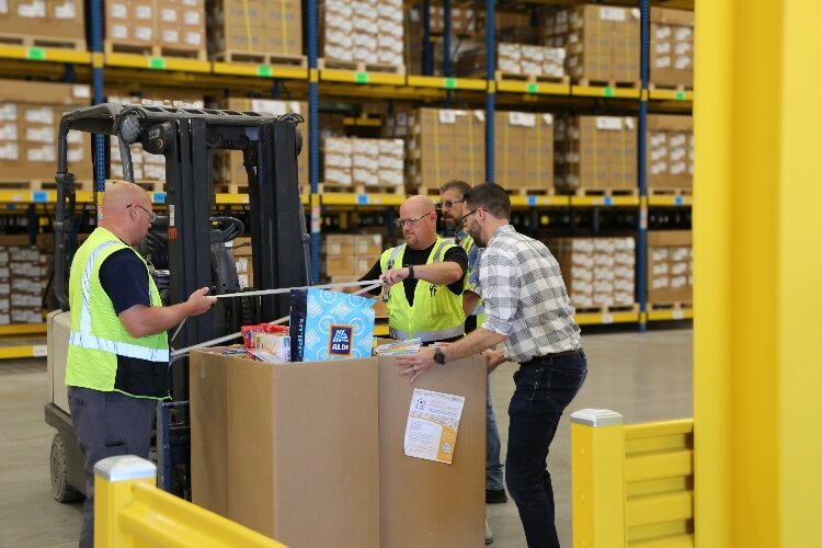Gentex warehouse employees move a pallet of cereal donations for Community Action House.