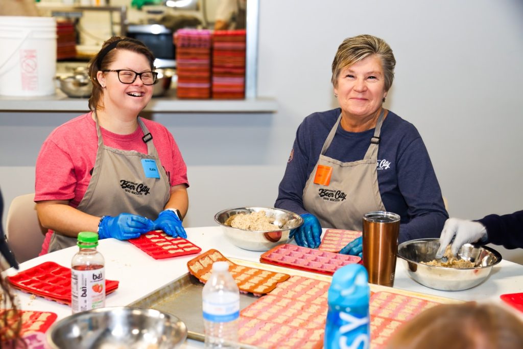 Jan works with Katie on her packing project at Beer City Dog Biscuits.