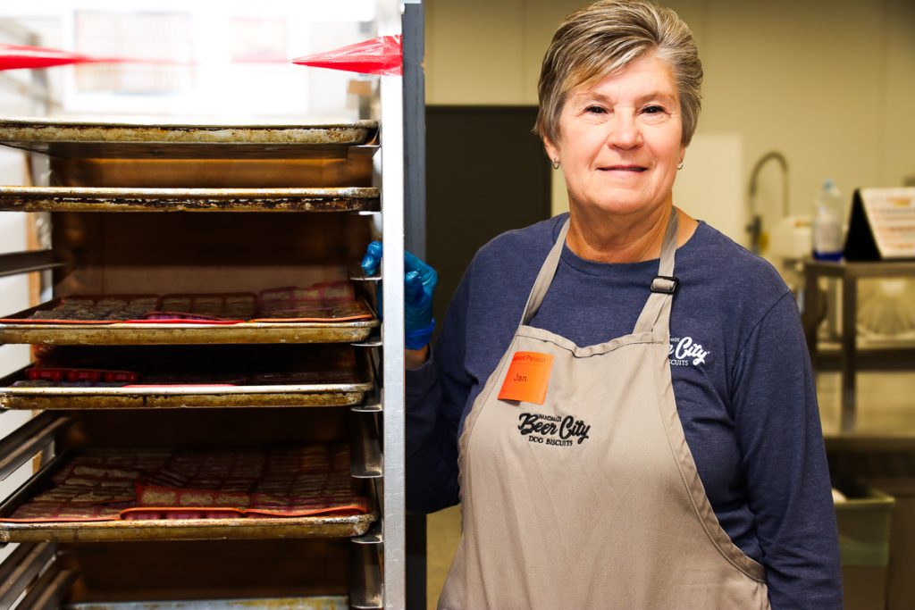 Jan has been volunteering at Beer City Dog Biscuits for a long time.