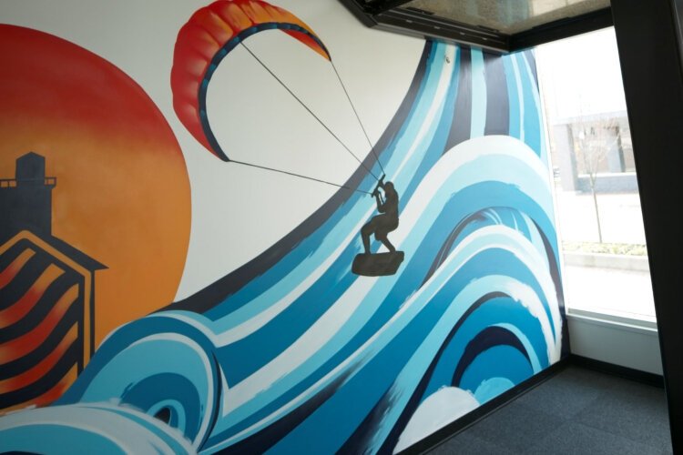 With flowing waves inspired by Lake Michigan and a kite surfer propelled by wind in front of the iconic Big Red lighthouse, the artwork embodies the synergy between natural beauty and technological progress.