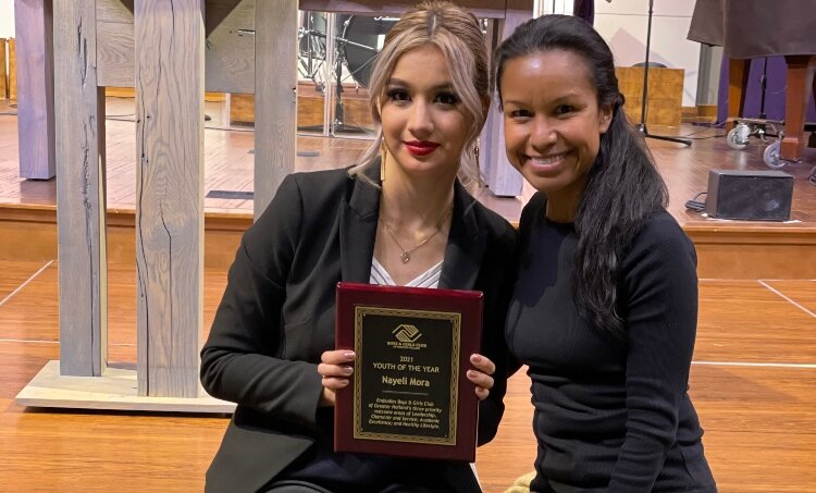 Nayeli Mora shows off her Youth of the Year award with Cynthia Martinez.