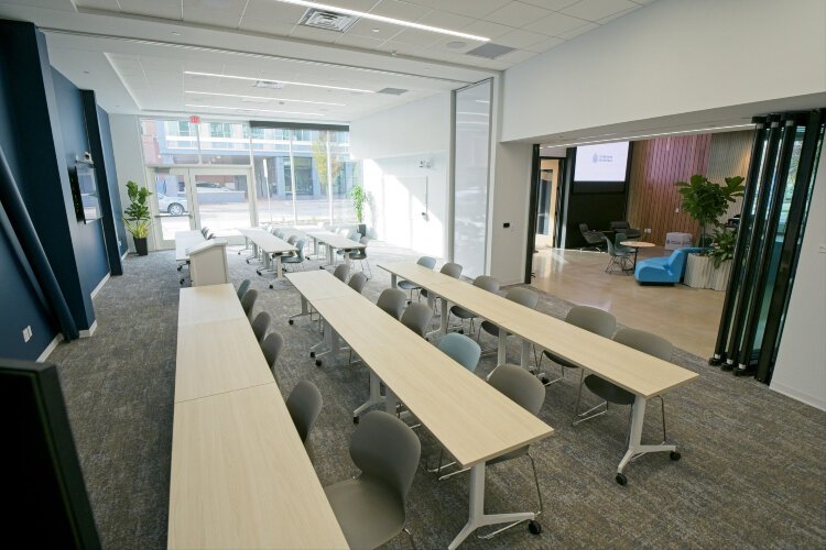 The first floor is dedicated to programming that supports entrepreneurship and community education, with room for up to 50 startup tenants. The second floor houses Lakeshore Advantage’s offices and additional spaces for small-business support organizations. On the third floor, flexible office suites are available for lease, catering to established companies.