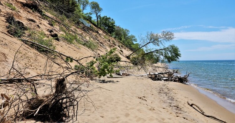 The park bars access to a dunes outlook platform in danger of collapsing, storm-whipped waves destroyed a stairway leading to the beach, and a portion of the beach set aside for dogs and their owners is closed. A number of trees that once stood high in the dunes now litter the shoreline.