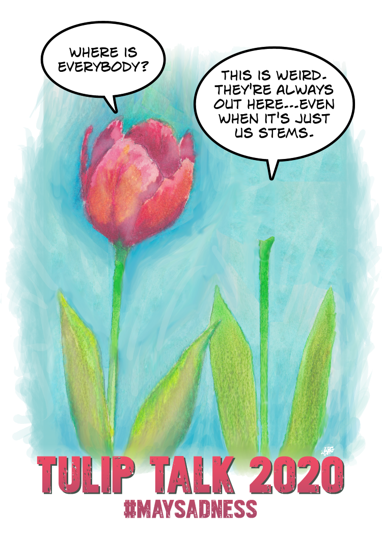 I’ve known the Sonscreens ensemble for a long time and, because I draw cartoons, they got in touch with me to do the artwork for the shirt. They wanted bright colors and cartoon balloons and the slogan TULIP TALK 2020 … with #MAYSADNESS underneath. The hashtag is meant to be a “sigh” for the festival fun we’re sad to be missing. It’s also a way to tag our collective stories and share them with each other, to let each other know the spirit of Tulip Time is alive and well, and we’re looking forward to next year by looking back at our most enjoyable memories of celebrations past.