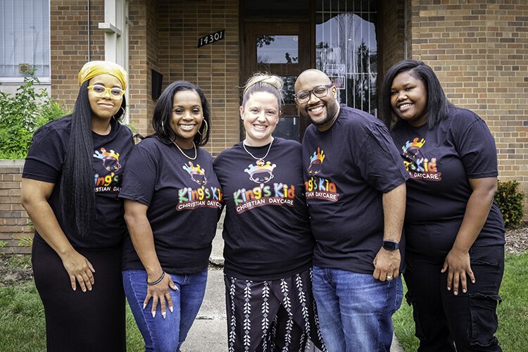 Brian Wells – From left: King’s Kid Christian Daycare staff members Lolita Granger, Tamara Jones, Megan Johnson, Matt Jones and Adrian Robison pose for a portrait in front of the Detroit child care center Wednesday, July 17, 2024.