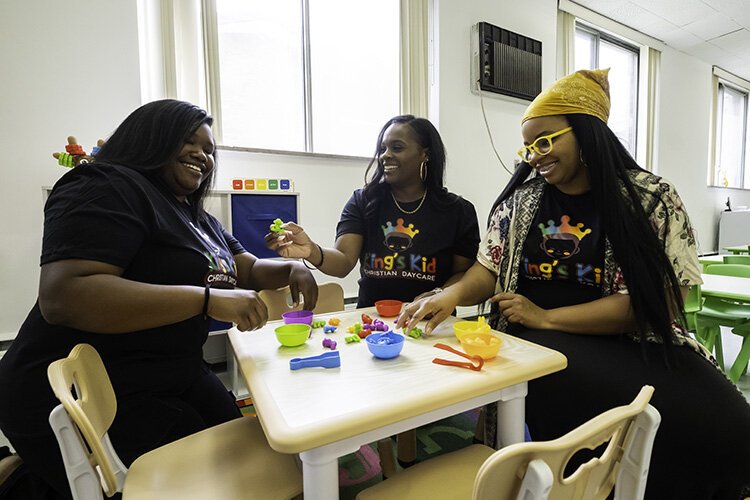 Brian Wells – King’s Kid Christian Daycare staff members Adrian Robinson, left, Tamara Jones, center, and Lolita Granger laugh Wednesday, July 17, 2024, as they play with toys in one of the classrooms in the Detroit child care center.