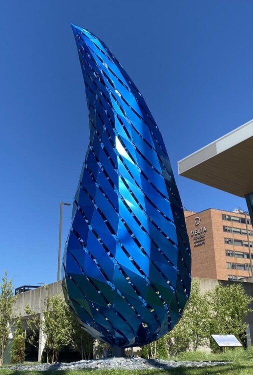 One Drop, created by Marc Moulton, was inspired by the WDCC and by how individual efforts when combined become major triumphs. The sculpture is a simple form built from rhythmic streams of individual pieces, illustrating how many individual elements together create a dynamic whole. It also symbolizes our beautiful and nearby waters.