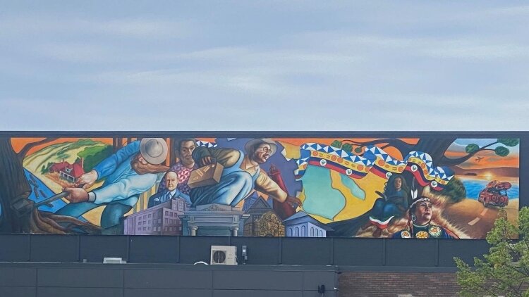According to the MCPAI’s press release, the mural is the visual story that “highlights the continuing presence of the indigenous tribal peoples, our lumbering boom and the industrial waves of progress that followed, and the impact of the Great Migration on our community in the 1930s and 1940s, which helped to fuel Muskegon’s remarkable contribution to the war years, our present and rich diversity, and the transformation of our community into this vibrant and diverse place rich with opportunity, culture, and an incredibly rich natural environment.”