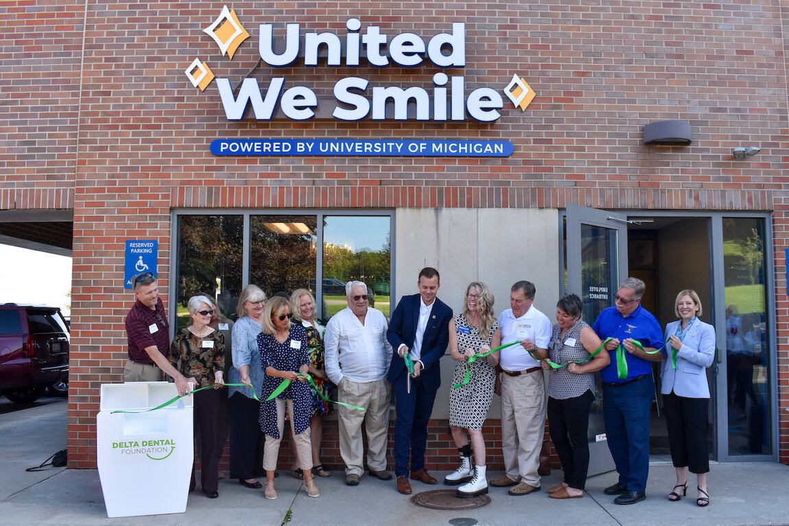 The United We Smile team celebrates together as they “cut the floss” to mark the clinic’s grand opening in Traverse City.