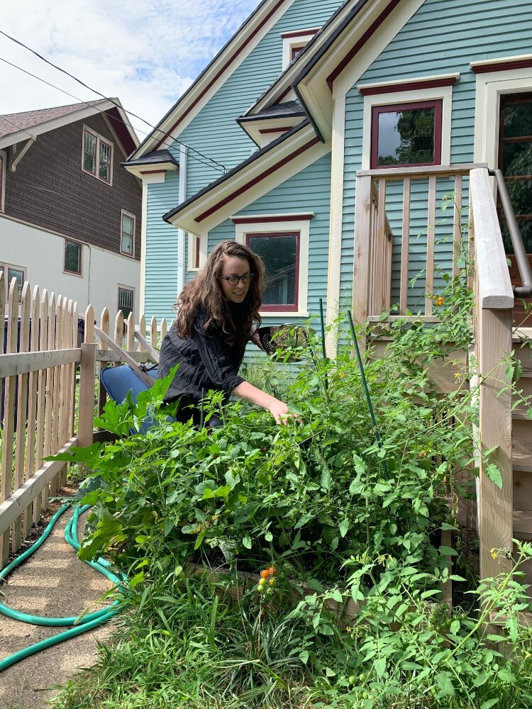 Alyssa Cheadle harvests tomatoes from her garden at her home in the Holland Historic District.
