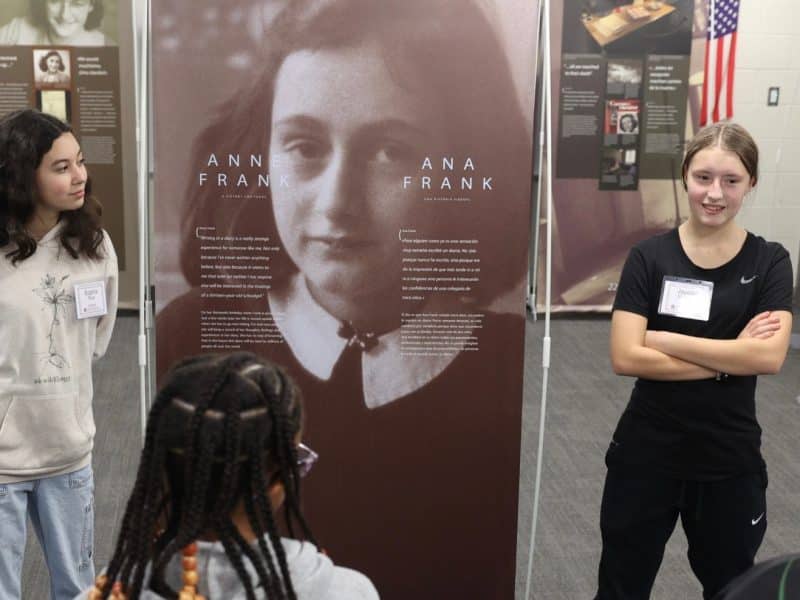 Student docents guide visitors through Anne Frank exhibit and film event focused on history, human connection, and community understanding.