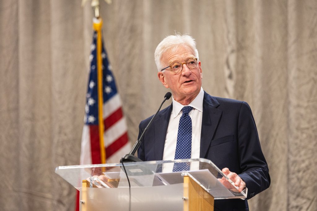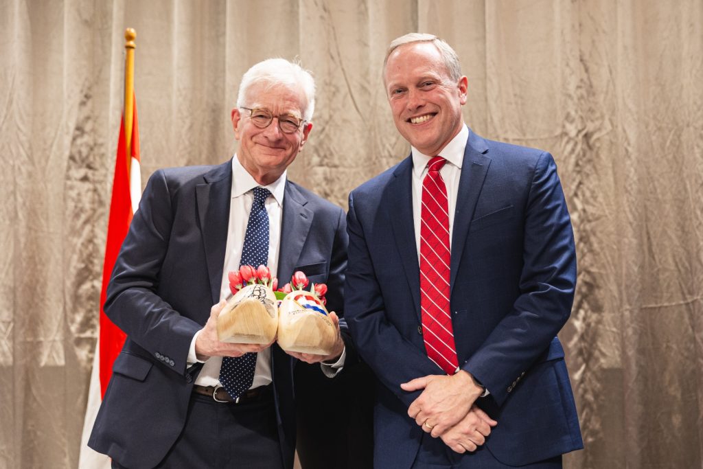 He opened with a story about his mother’s interaction with Dutch royalty during their 2015 visit to West Michigan. King Willem-Alexander and Queen Máxima visited Grand Rapids that year to celebrate the region’s strong Dutch heritage and economic ties. Their stop included a ceremonial tree planting at Frederik Meijer Gardens & Sculpture Park.