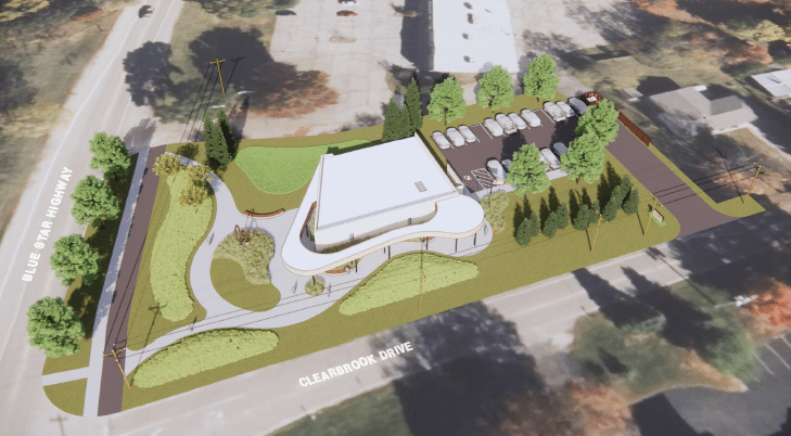 The dated building will become a more accessible, welcoming, and pedestrian-focused community space along the Blue Star Highway Corridor.