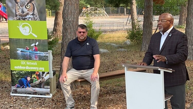 Rawlan Lillard II, deputy director at MiLEAP, speaks at ODC’s “Best of Summer” celebration as Bob Wandel, ODC education director, looks on.