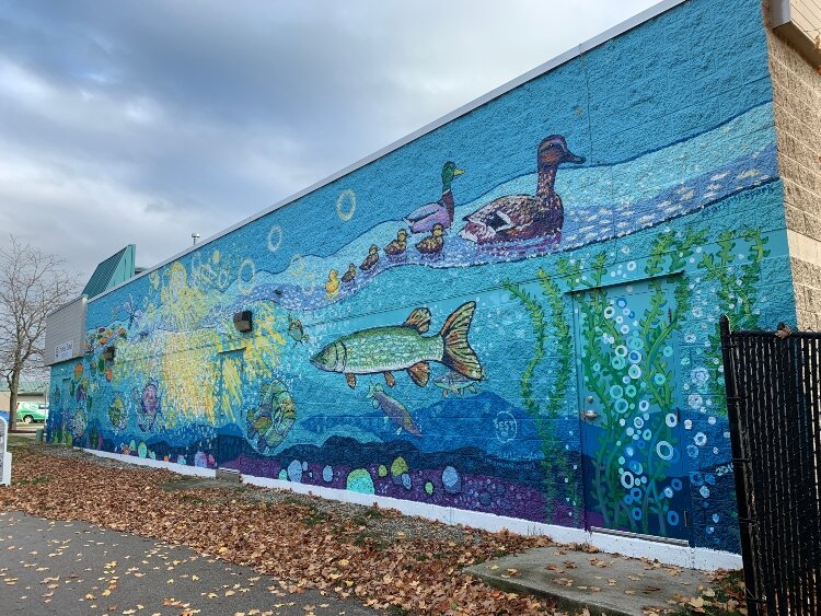 “It’s a fish-eye view of Spring Lake,” says Stanford-Butler. “He (Schoon-Tanis) researched the kind of fish that are in Spring Lake and accurately painted them into the mural.”