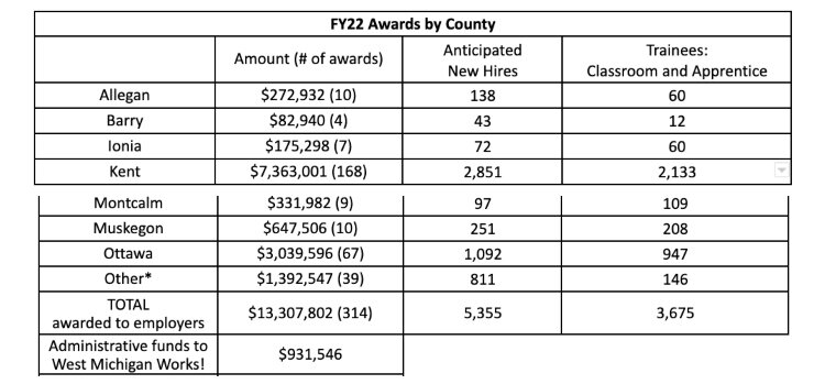 This year, employers in Allegan, Barry, Ionia, Kent, Montcalm, Muskegon, and Ottawa have been awarded $13,307,802 in training funds. Statewide, over $40 million was awarded to more than 1,000 Michigan businesses.