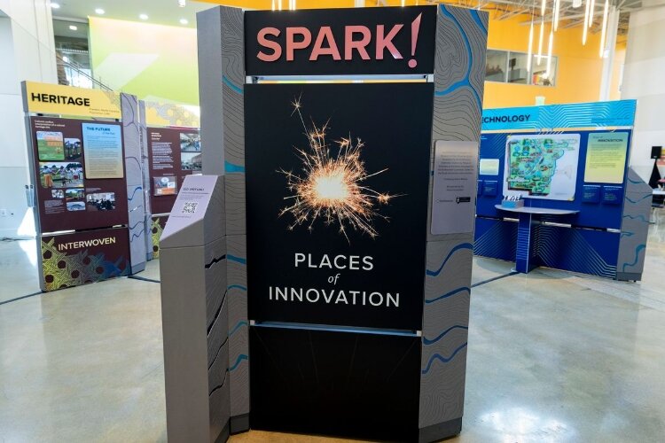 The exhibit, “Spark! Places of Innovation,” is at the Loutit District Library through Feb 25.